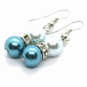 Blue and white orchids on the left hand, blue and white lilies on the right hand.