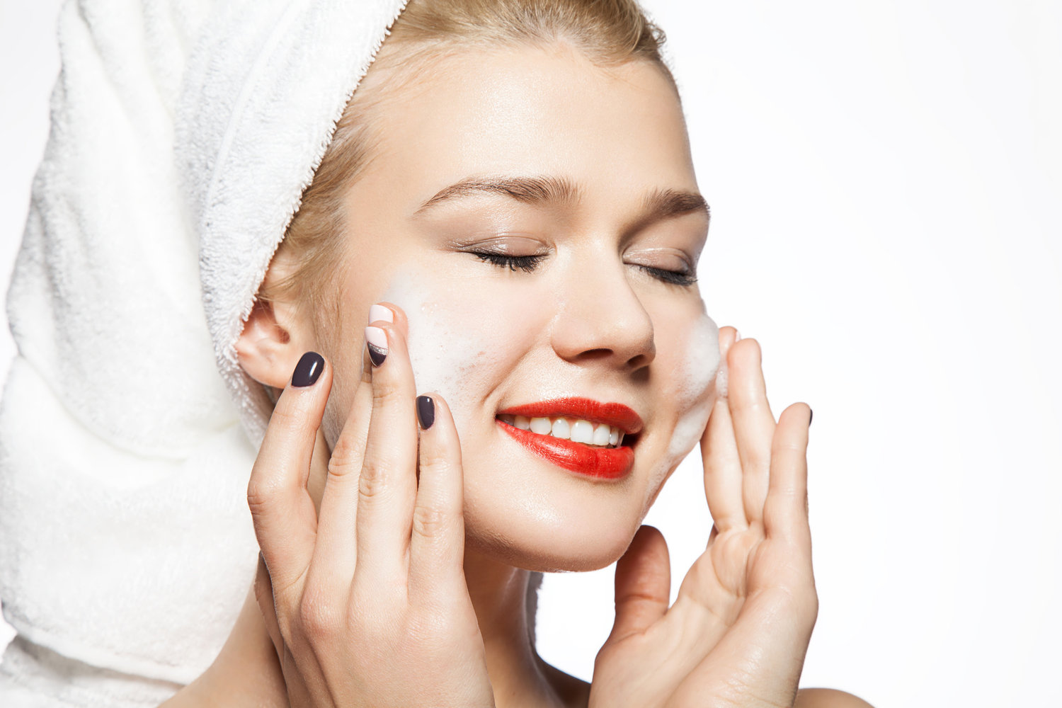 Close-up of a beautiful woman cleans the skin with foam for a face standing on a white background in a towel on her head February 11, 2021 | | Leave a Comment