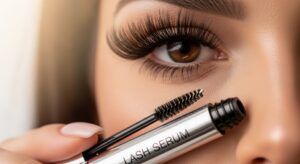 Close-up of a woman’s eye with dramatic false lashes and a lash serum wand. January 16, 2026 | | Leave a Comment