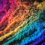 • Still using the Be Creative Brights pigments, work across the nail, slowly adding stripes of “Ice Pops” (orange), “Sunshine” (yellow), Cut Grass (green), “Ocean” (blue) and “Flip Flops” (purple), blending the edges of each colour where they meet.