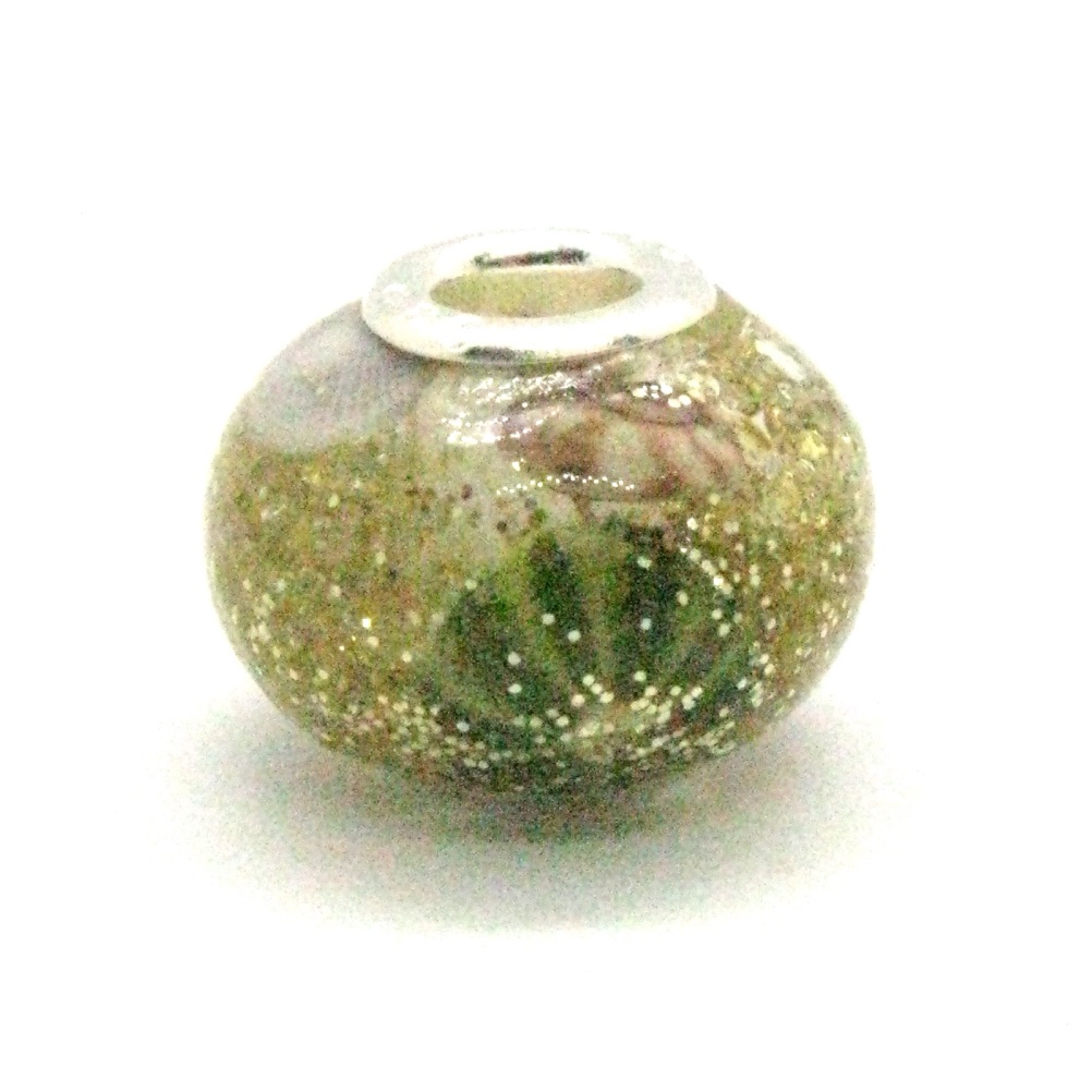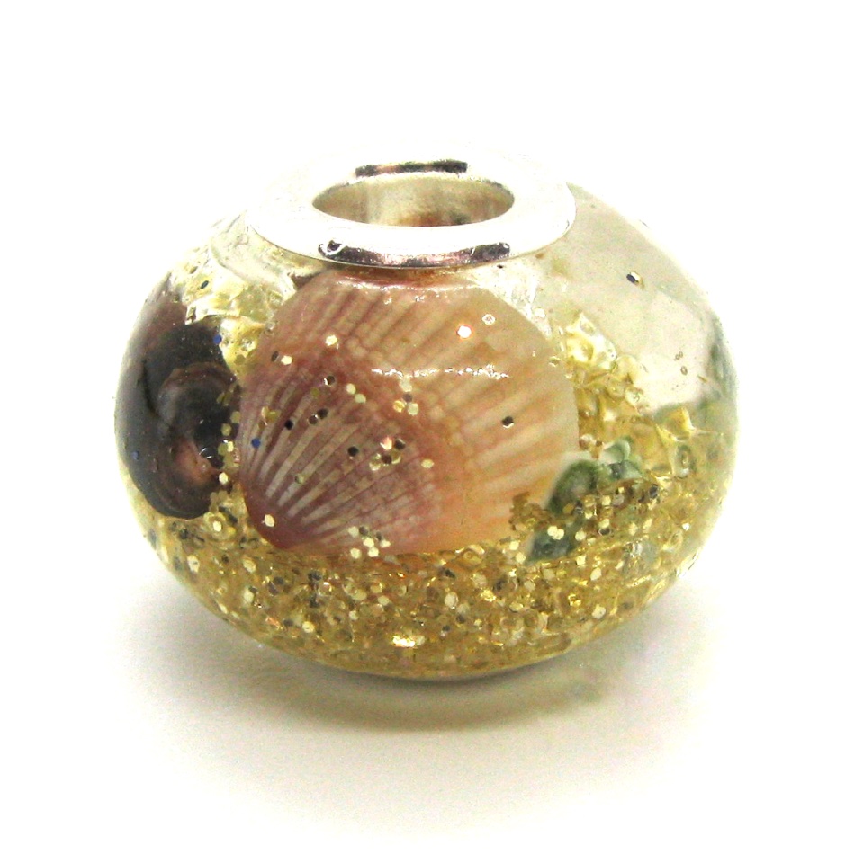 Traditional round shaped European style charm bead in an XL size. Champagne gold glitter ‘sand’ and tiny real seashells are nestled in clear resin to create this little day at the beach in a bead.