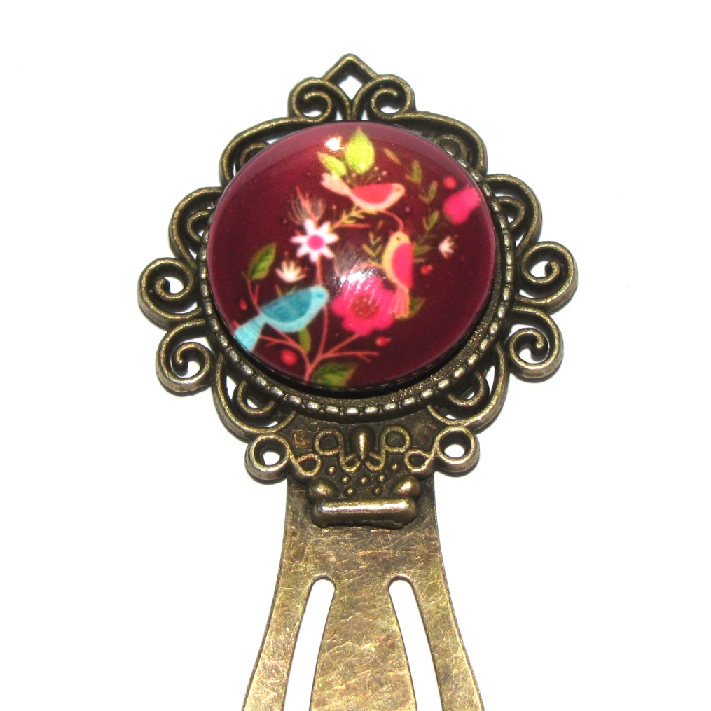 Antique bronze bookmarks with assorted bird designs in glass cabochons.