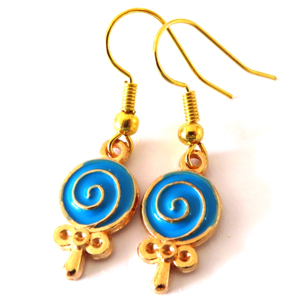 Blue and gold charms on gold plated French hooks.