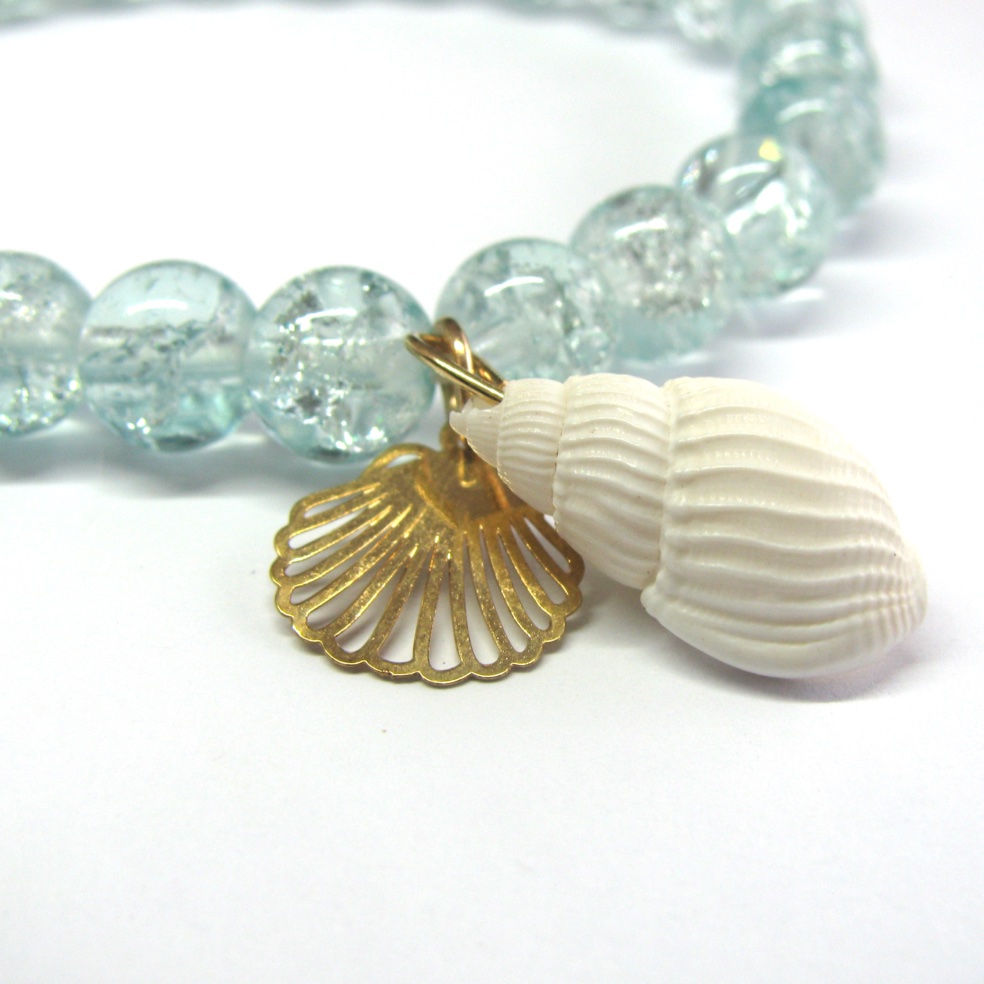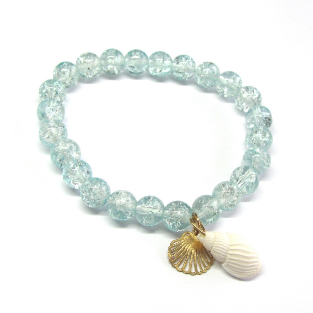 Aqua-coloured acrylic beads on an elasticated band, with shell and gold charm accents.