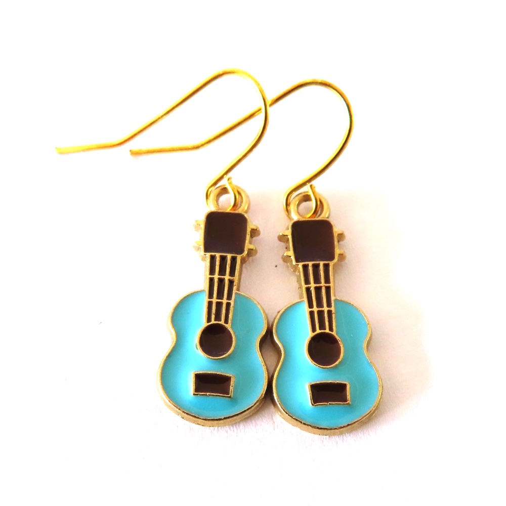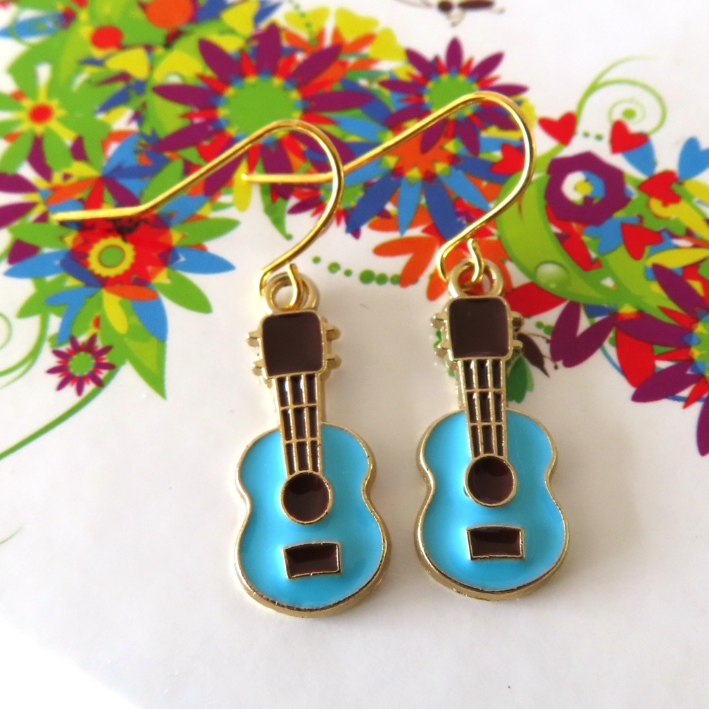 Blue, black and gold guitar charm earrings on gold plated Shepherd’s hooks.