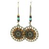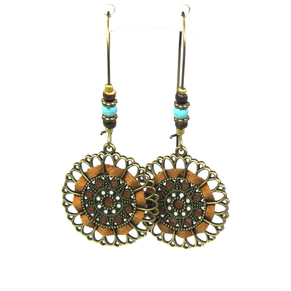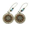 Bronze filigree charms with coffee coloured inlays, dangling off turquoise beaded bronze ear wires.