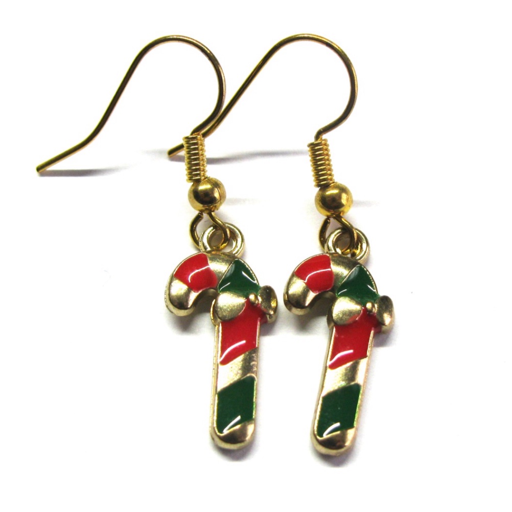 Cute little red, green and gold candy cane charms (with little gold bows) dangle off of gold plated ear wires.