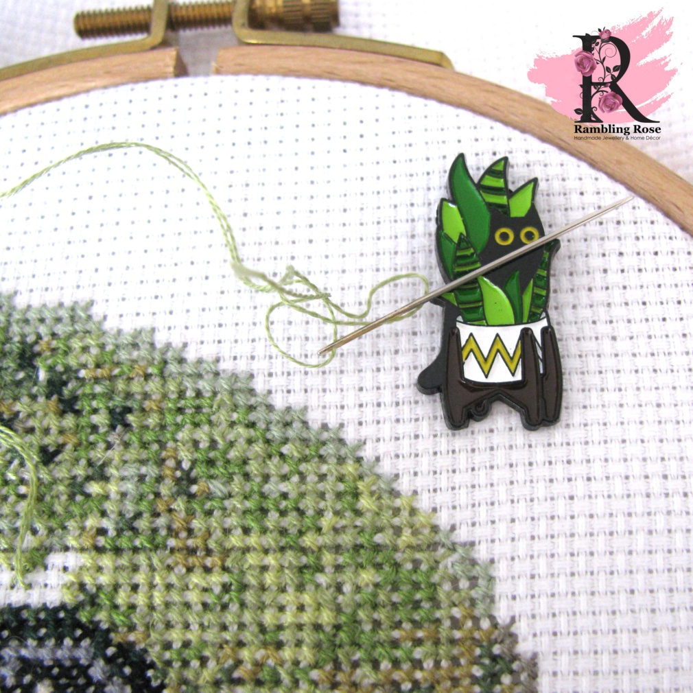Cat and plant magnetic needle minder to keep your needle safe while you’re changing floss colours or storing your item between stitching sessions.