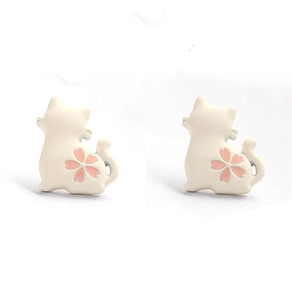 Off-white cat shaped stud earrings with pink cherry blossom detail.