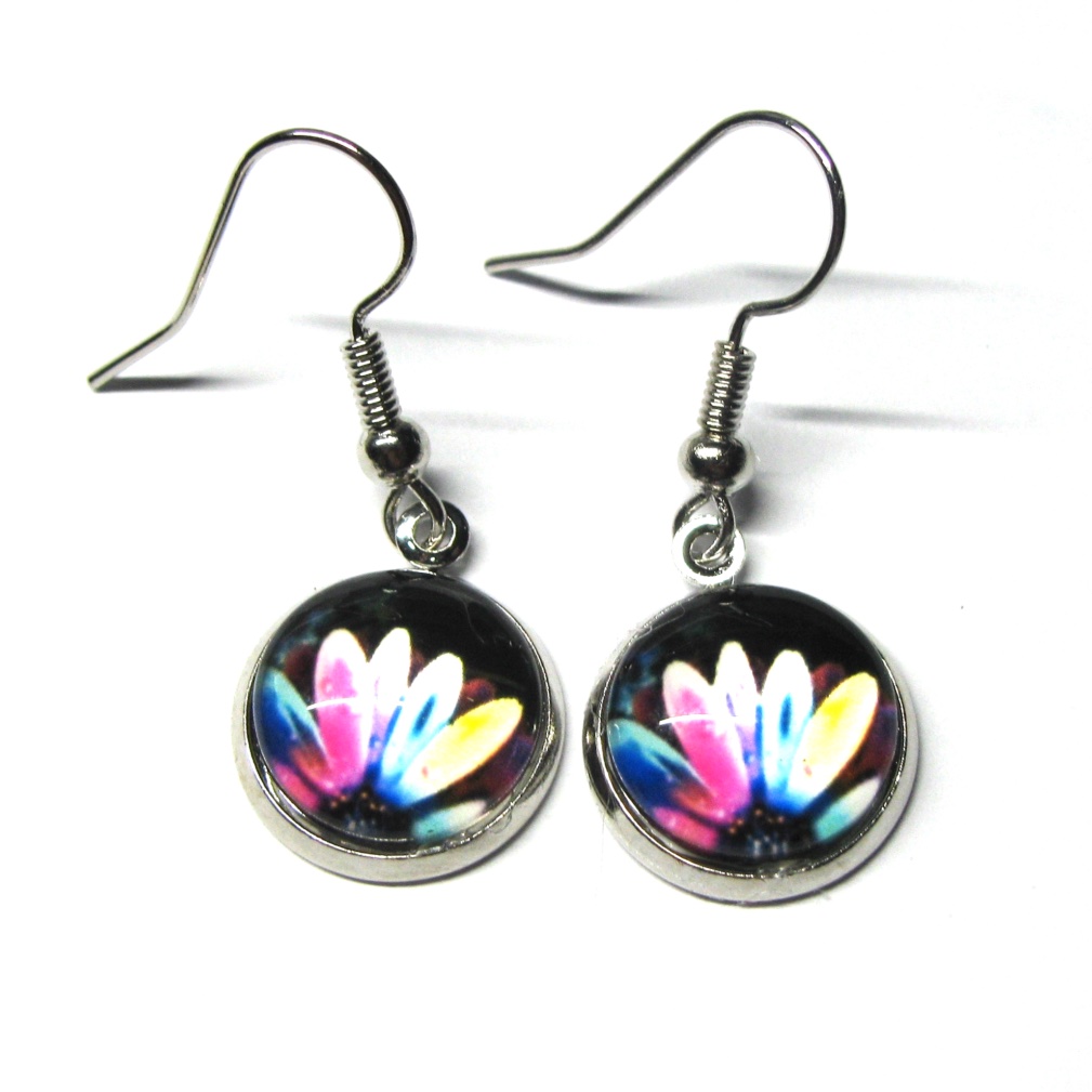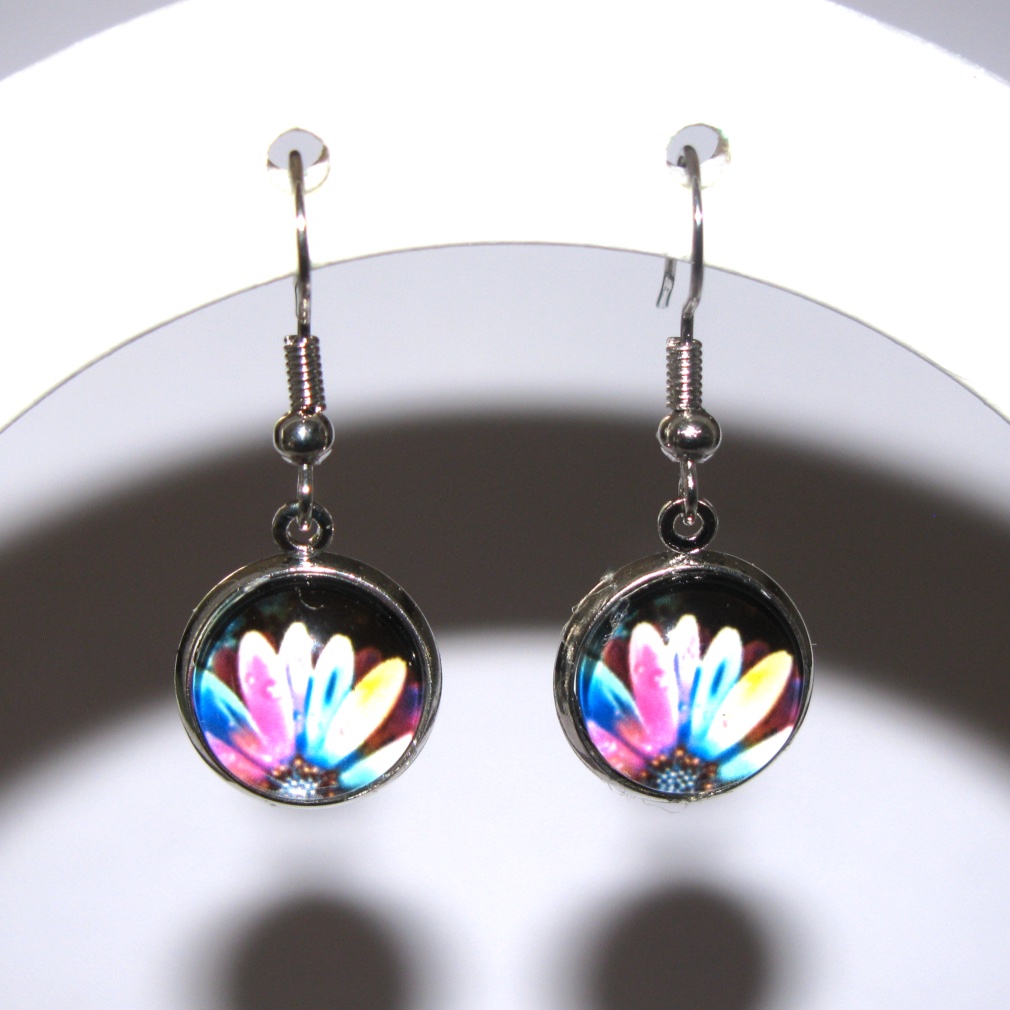 Colourful daisy patterns set in bezels with glass cabochons on French ear wires.