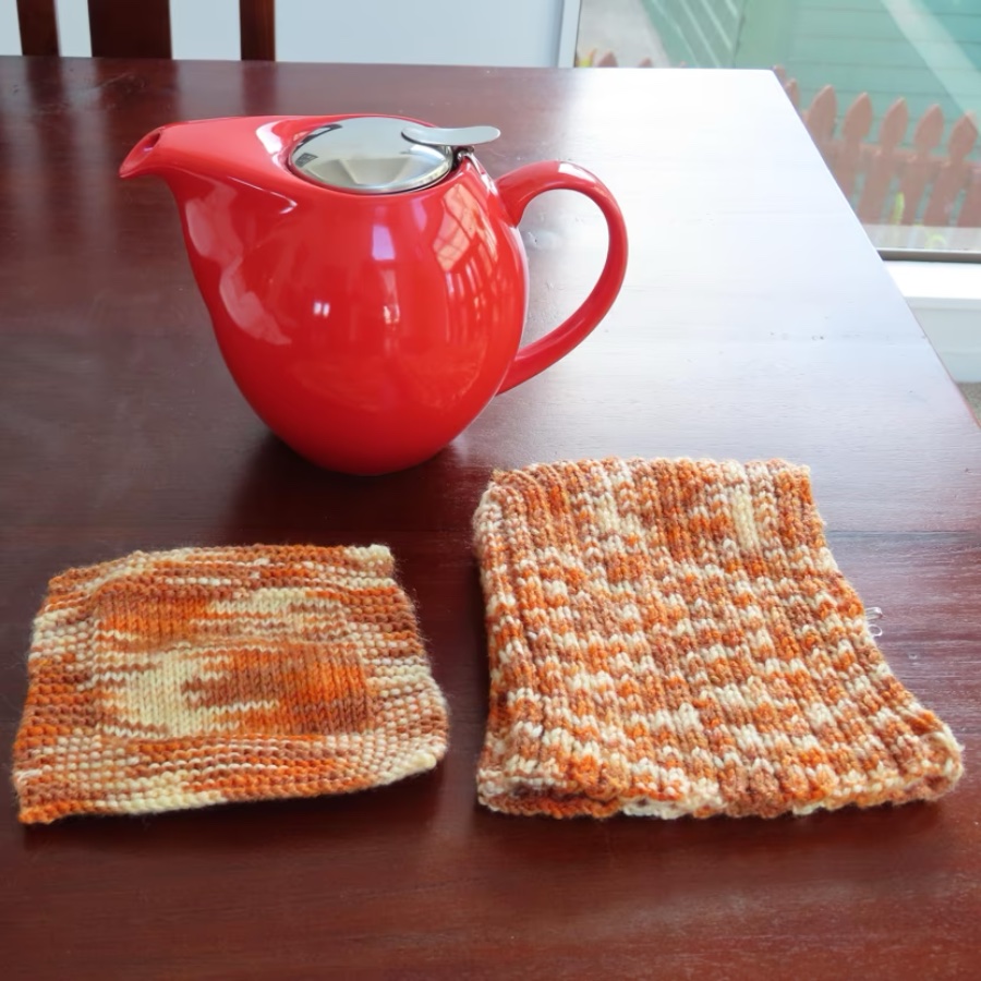 Tea cosy for a high spouted teapot that has a loose leaf tea strainer inside, includes a pattern for a little square teapot holder.