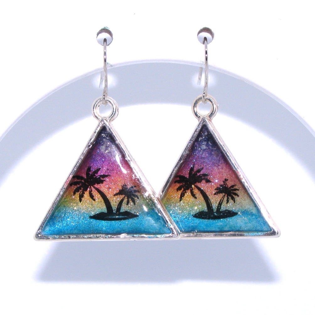 Black resin set in triangular bezels with an ombrΓ© island sunset scene on platinum ear wires.
