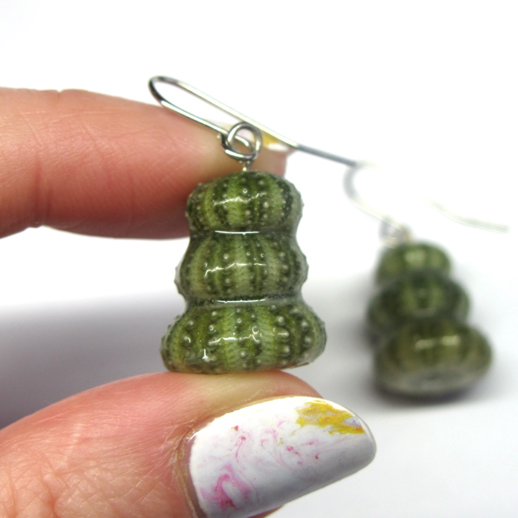 All our Sea Urchin or Kina Shell earrings are made with pieces of real shell.Β The shells are hand-picked by me (or my husband), while we’re out beachcombing. Only completely empty shells are collected, and even though they were empty when picked up, the shells have been thoroughly soaked, scrubbed clean with a soft brush, sun dried for a week and finally coated with a clear acrylic coating to help strengthen the shell. The back of the shells is white.