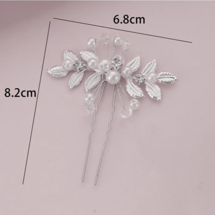 Elevate your bridal or school ball hairstyle with these silver Leaf, Pearl & Diamanté Hair Pins.