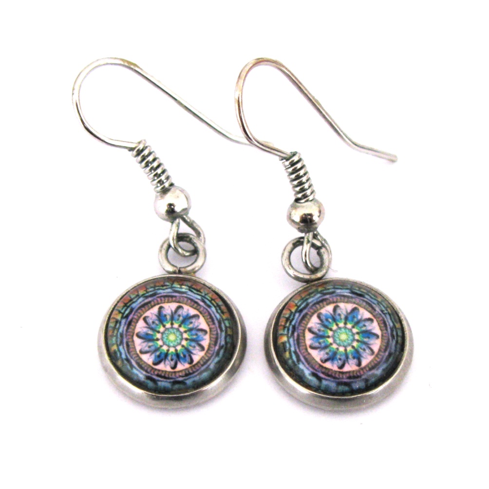 Pink and blue mandala cabochons set in silver bezels and dangling off of silver French hook ear wires.