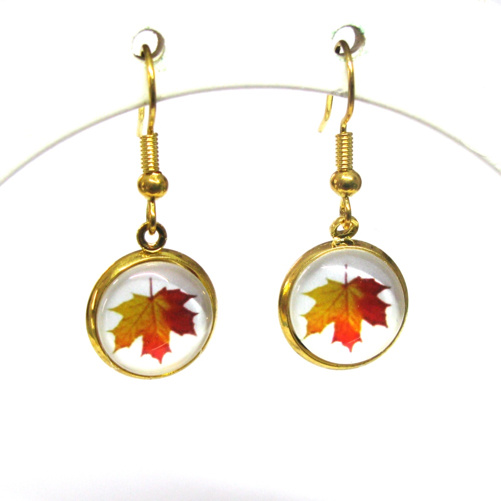 Yellow and red maple leaf patterns set in bezels with glass cabochons.