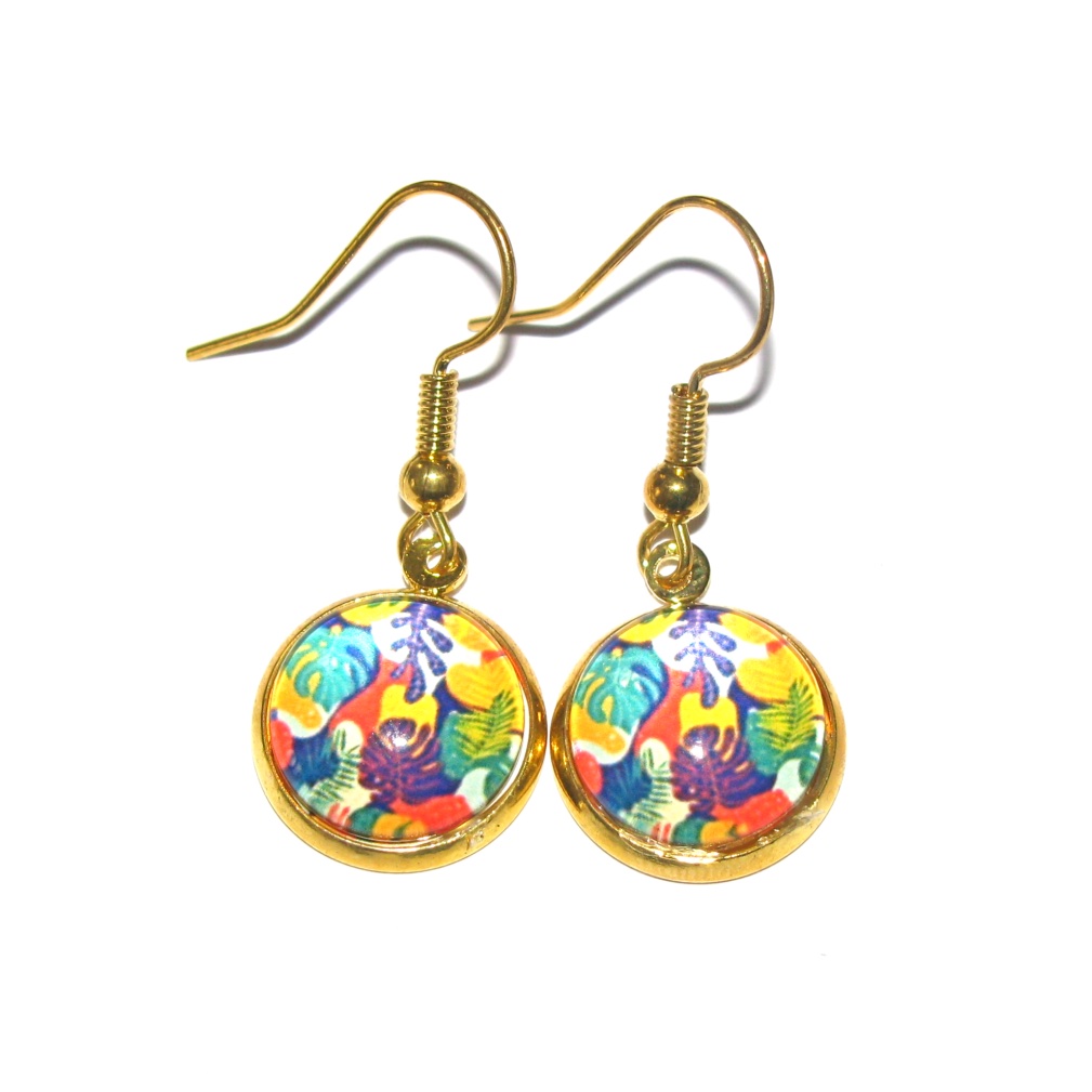 Purple, red and yellow Monstera leaf patterns set in bezels with glass cabochons.
