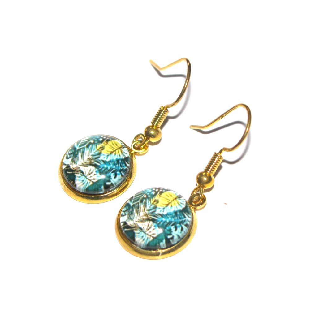 Teal and yellow Monstera leaf patterns set in bezels with glass cabochons.