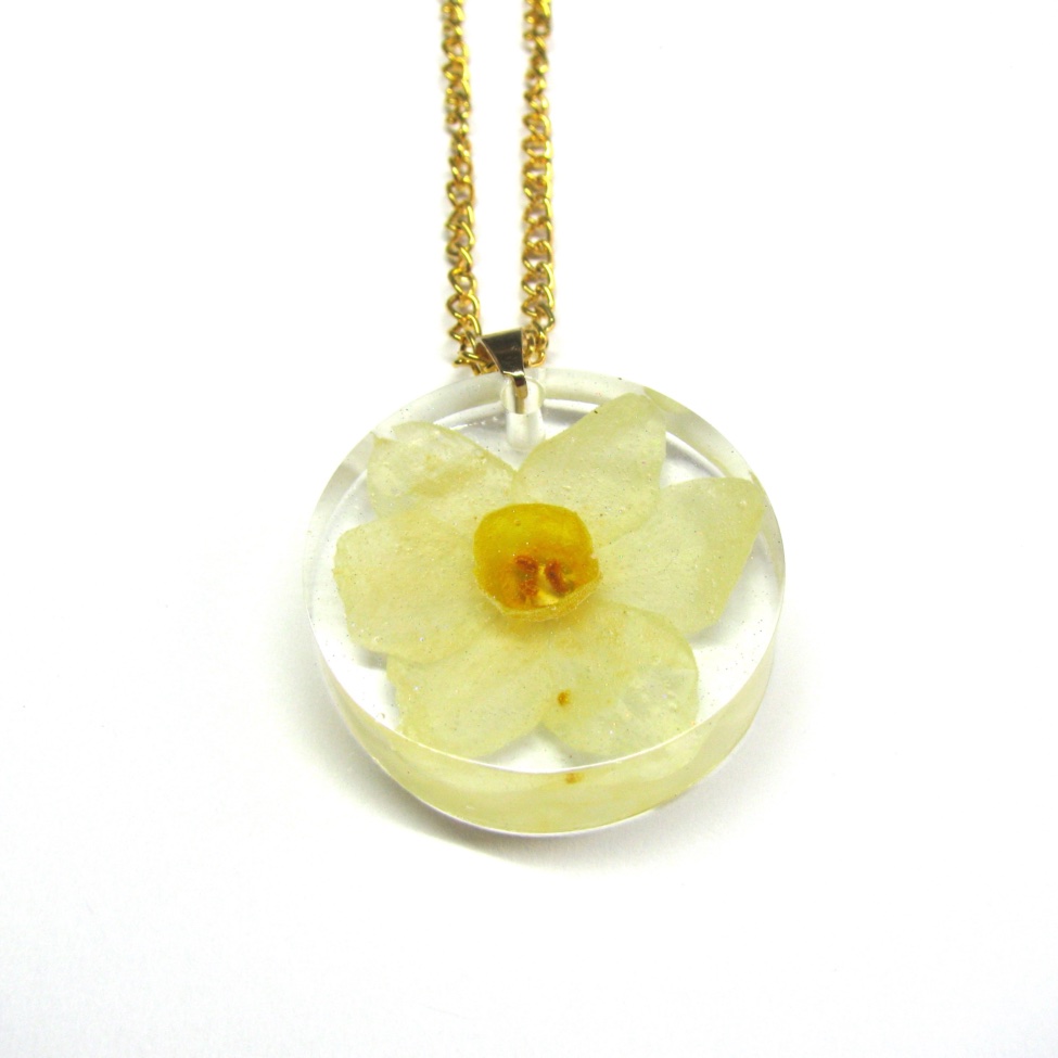 Lightweight resin pendant cast into a round shape with a real narcissus (daffodil) flower set inside, dangling off a 3mm wide gold chain.