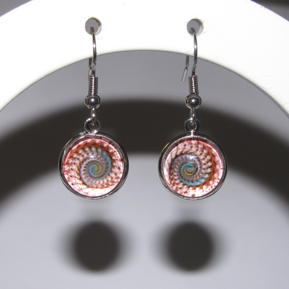 Brown and blue octopus / nautilus patterns set in bezels, with glass cabochons, that dangle off of French hook ear wires.