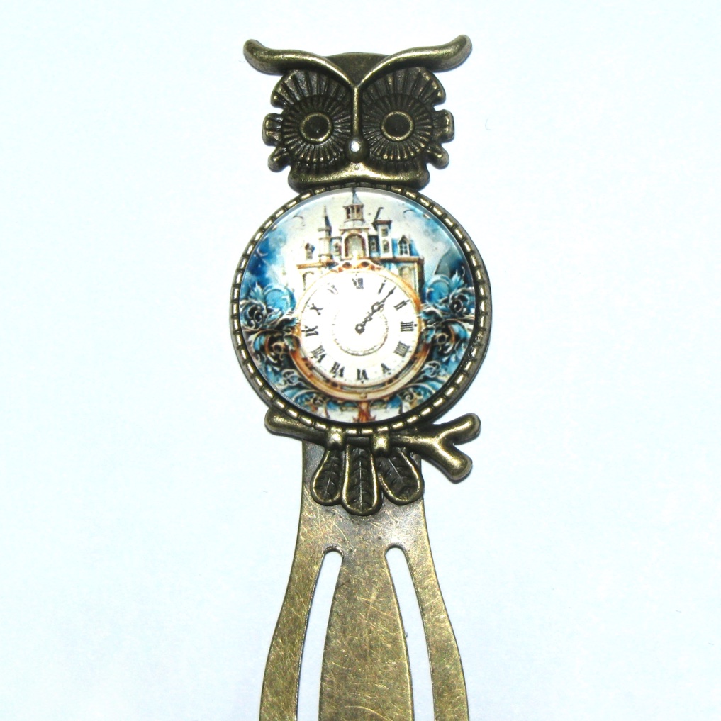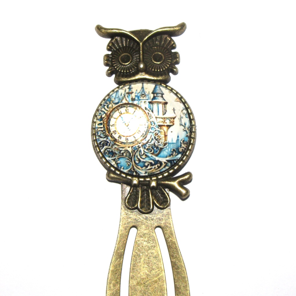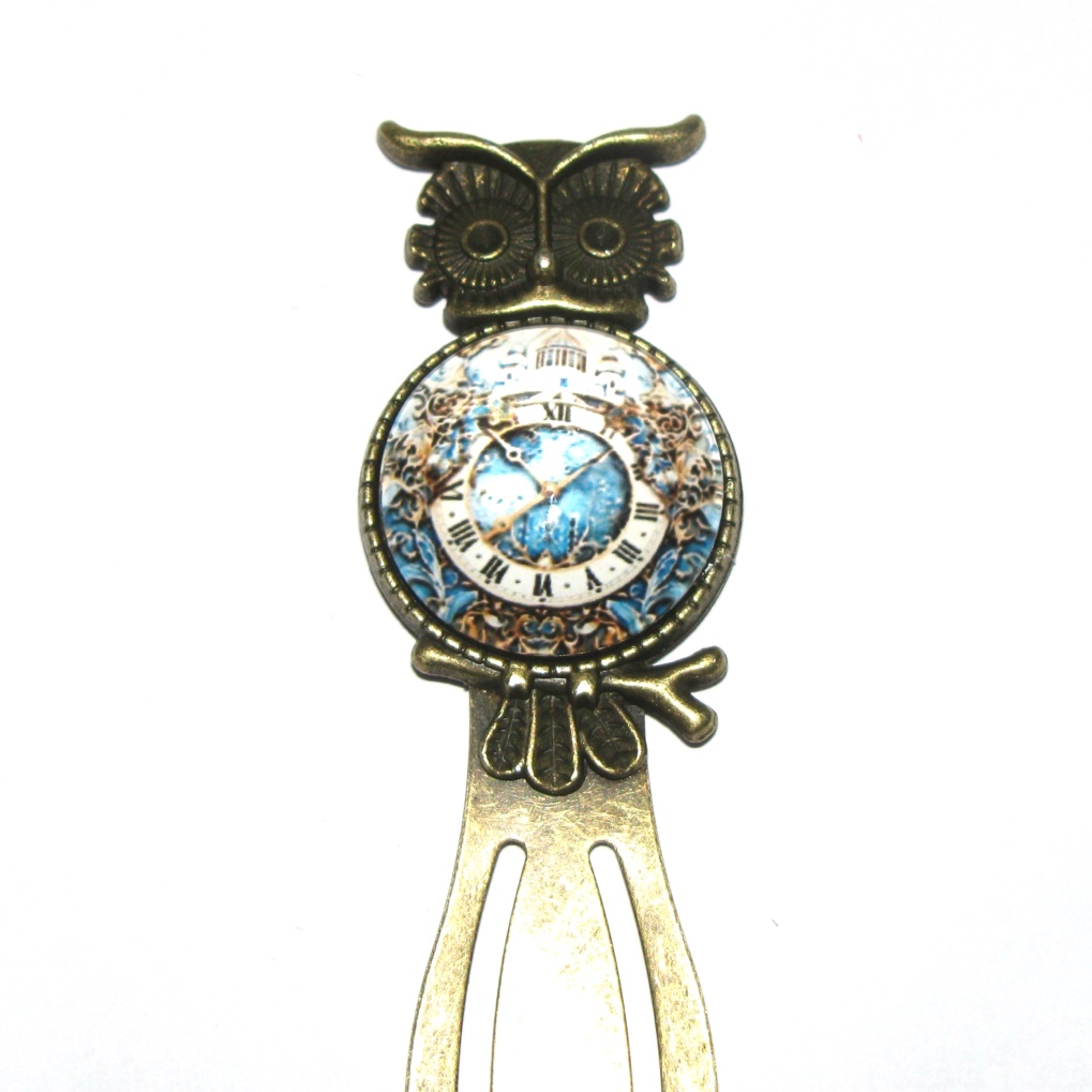 Antique bronze bookmarks with an owl design that sticks up above the pages with either a clock pattern, or sun and moon pattern, in a glass cabochon.