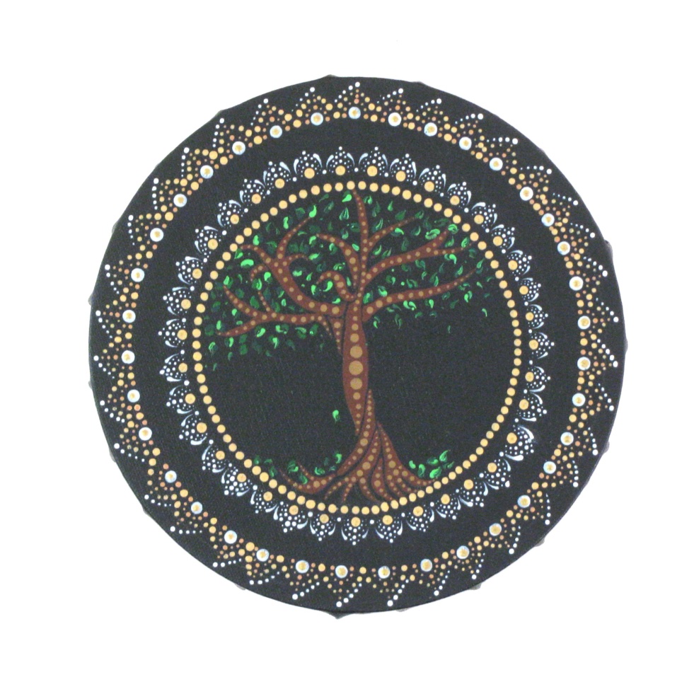This is a unique, hand painted 8 inch diameter canvas features a twisted tree with falling leaves surrounded by a lacy dotted frame.