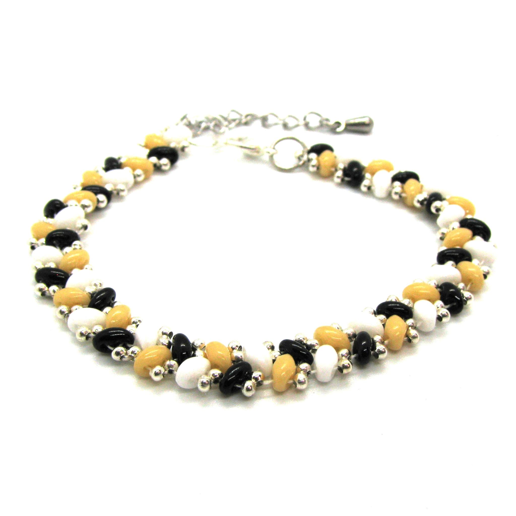 Black, beige and white Superduo / Japanese two-hole beads with silver beads, joined together with peyote stitch.