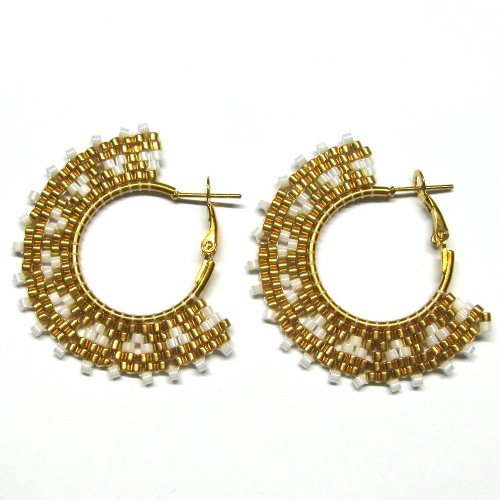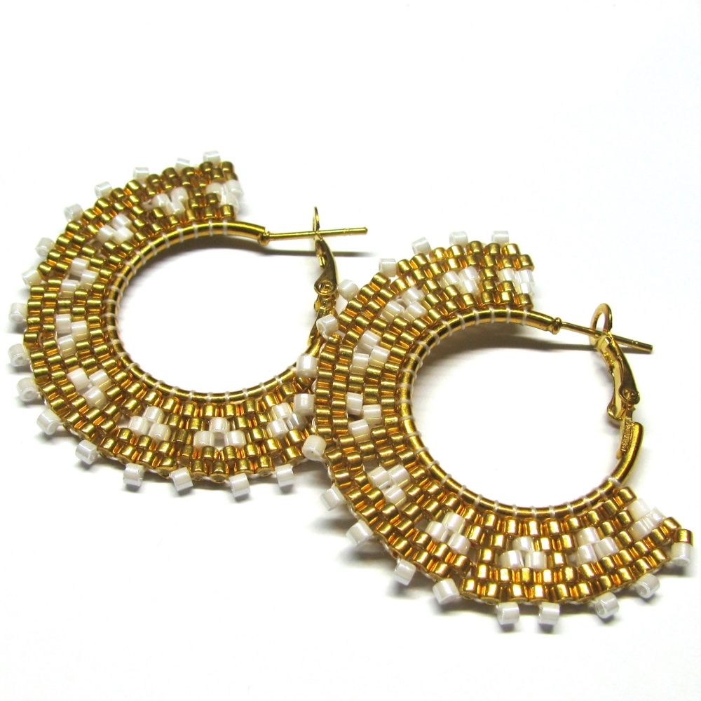 Assorted handmade beaded hoop earrings. Most of these hoops have been made using peyote stitch.