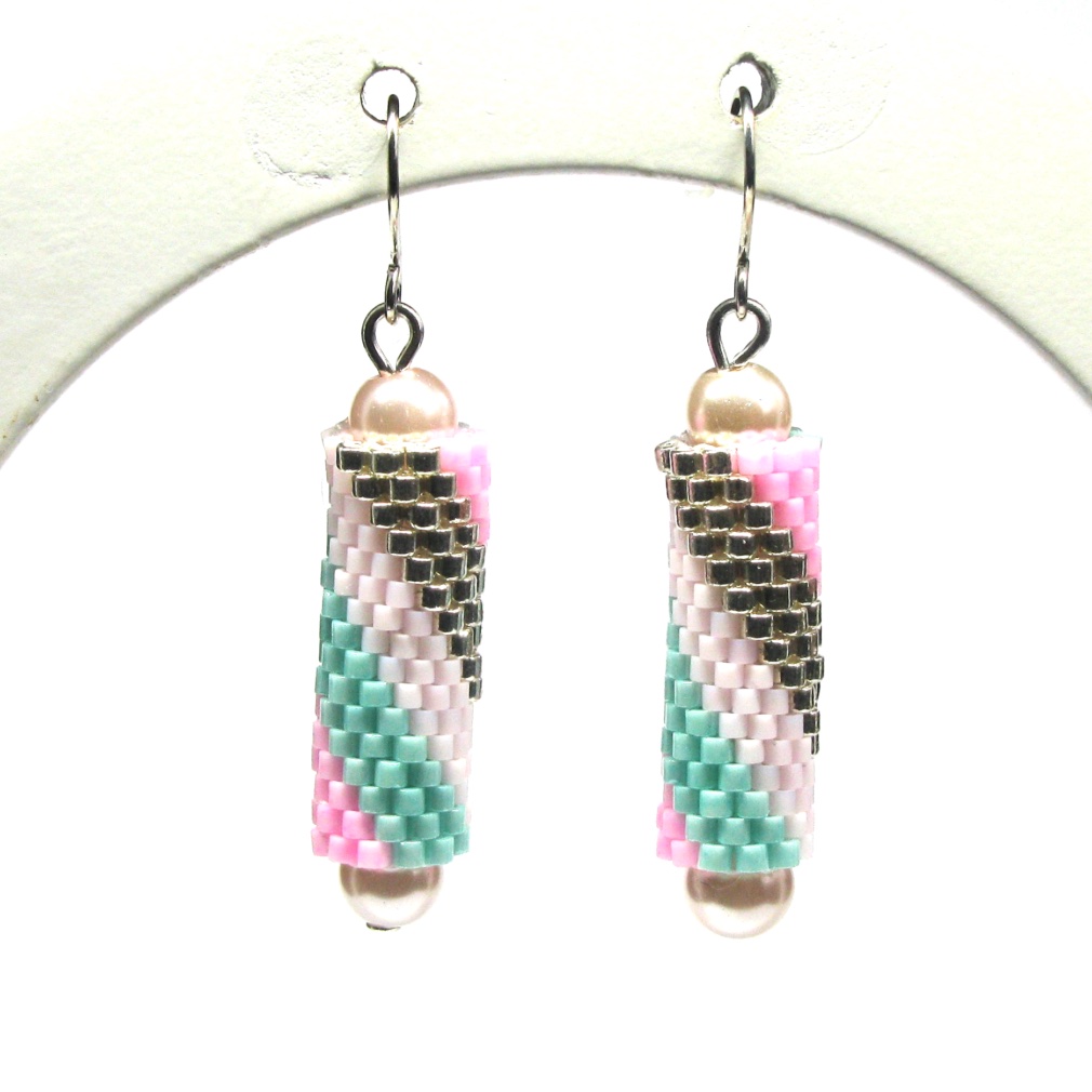 Hand-stitched peyote tube earrings with pearl ends. Each little Miyuki Delica bead has been sewn carefully into place to create these eye-catching spiral earrings.
