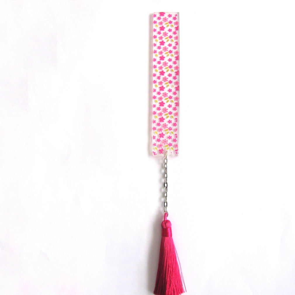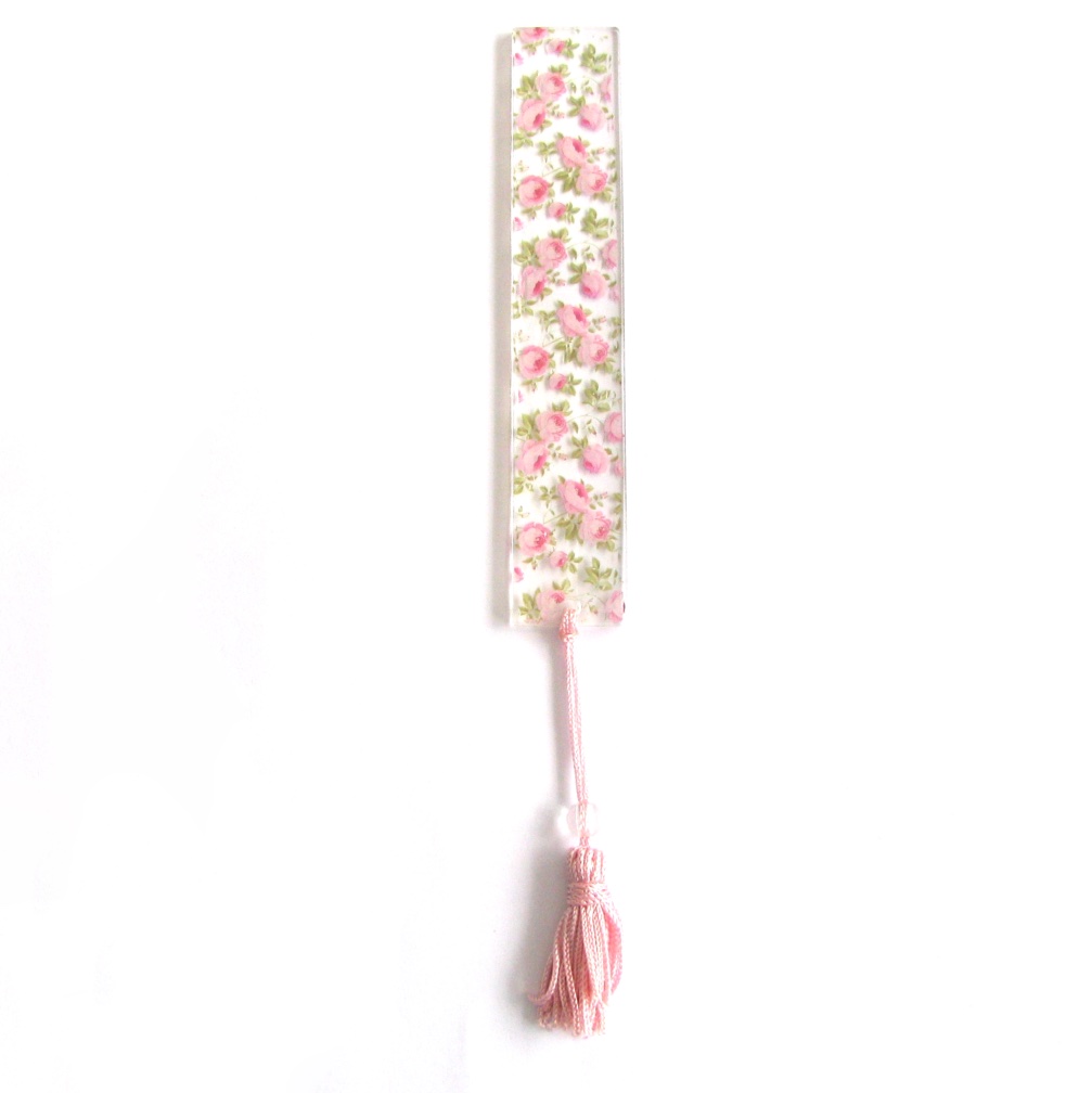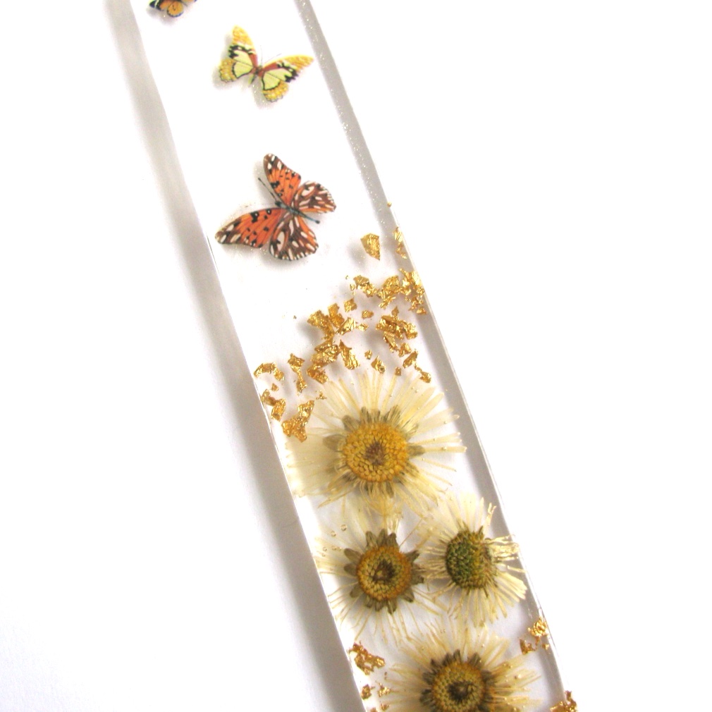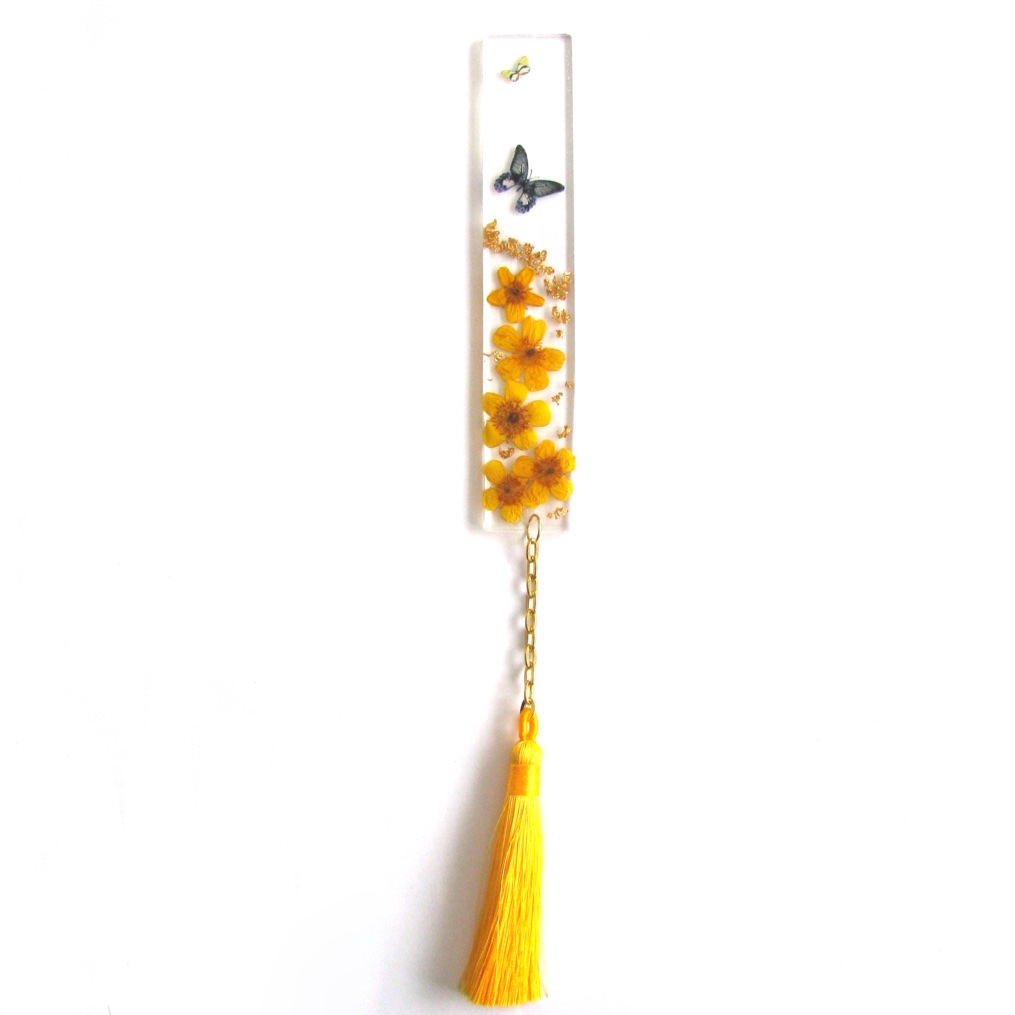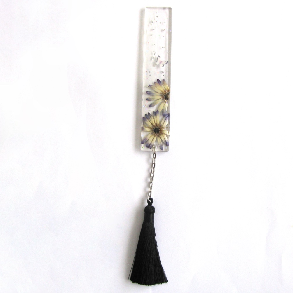 Handcrafted resin bookmarks with floral, butterfly, and foil embellishments, and dangly tassels.