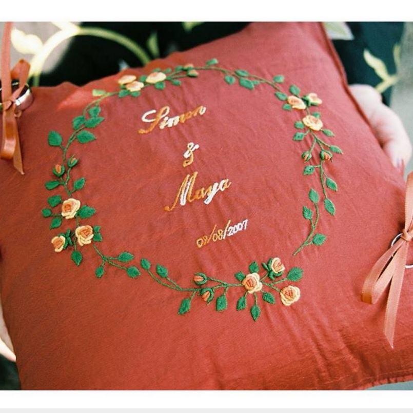 Wedding ring cushions need to be ordered well in advance, as all embroidery is done by hand.