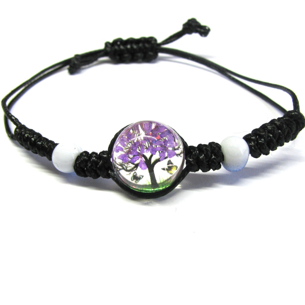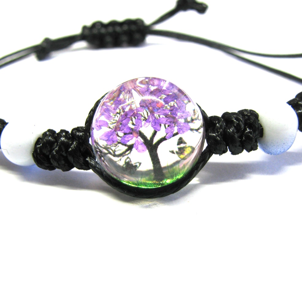 A purple Jacaranda tree in bloom on grass, with butterflies flitting around, strung on knotted black cord.