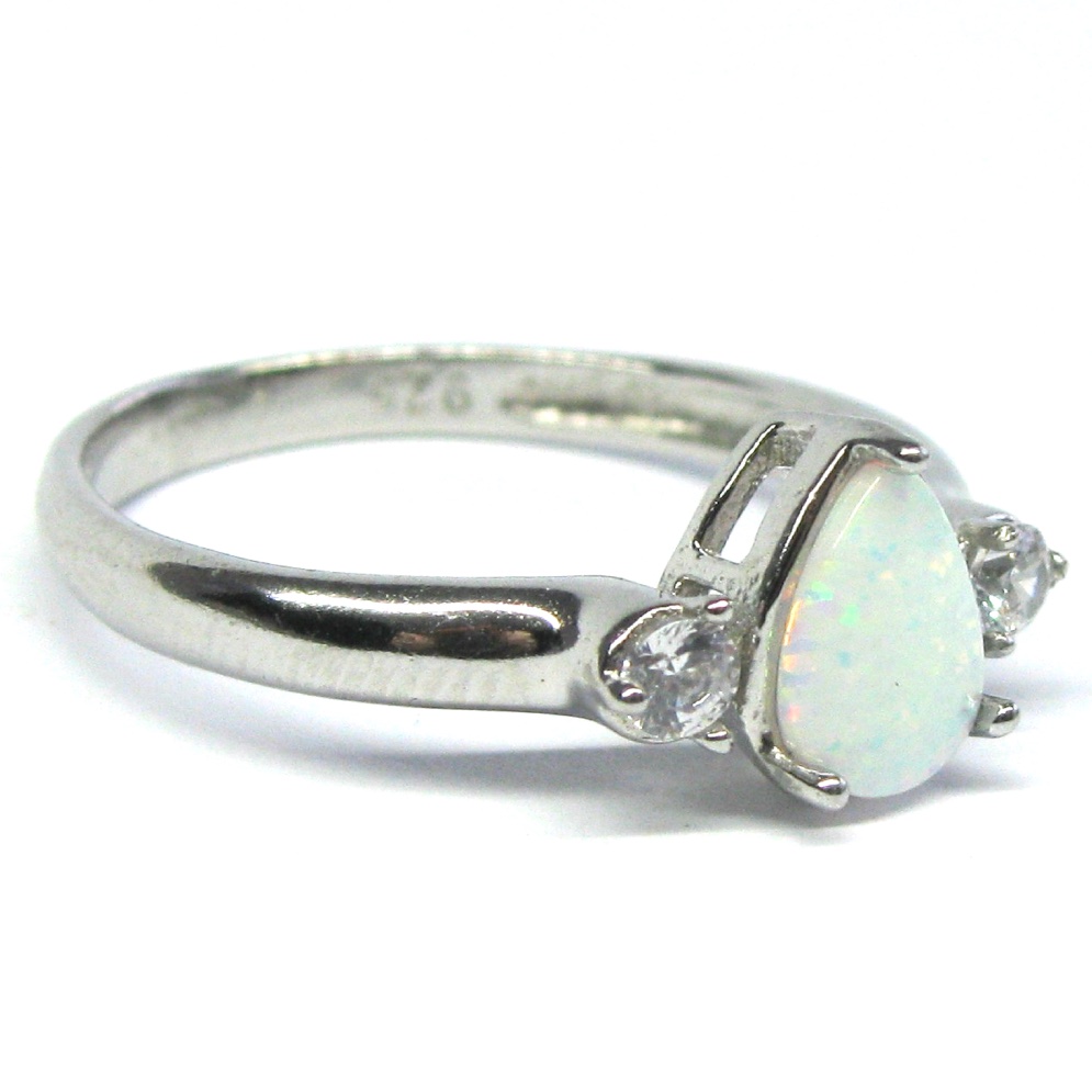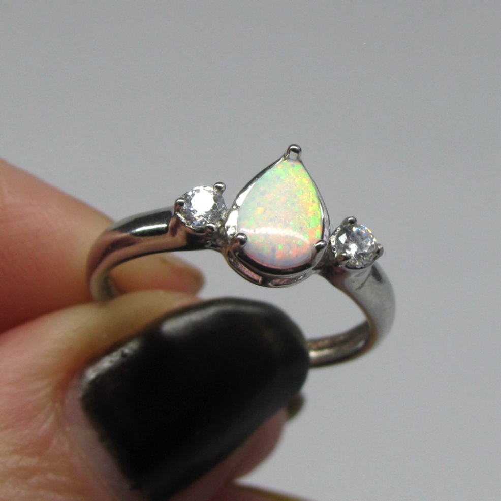 Pear or teardrop-shaped synthetic opal with cubic zirconia on either side, on a sterling silver band.
