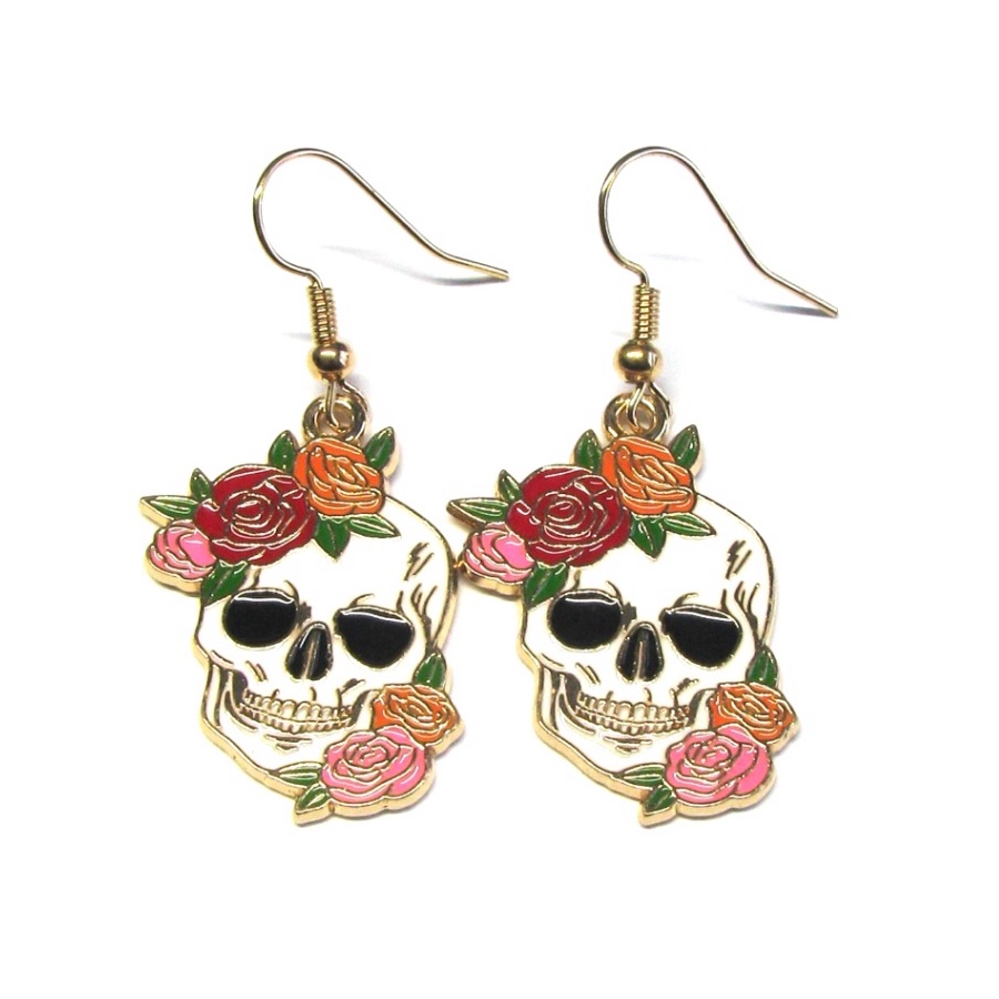 These whimsical skull and rose earrings are the perfect accessory for Halloween, or the Day of the Dead / Dia De Los Muertos celebrations.