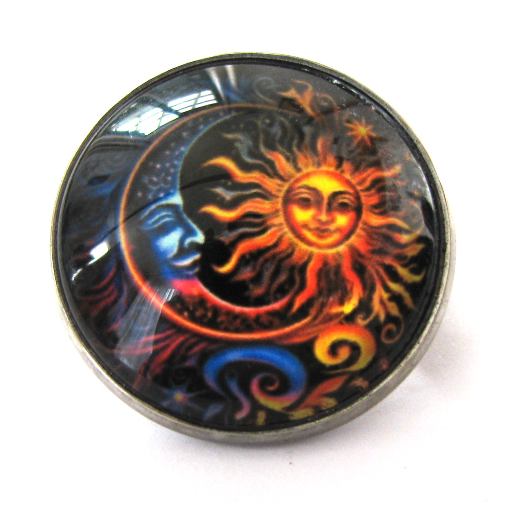 Blue and orange sun and moon design under an acrylic cabochon, set in a stainless steel round bezel with a brooch pin back.