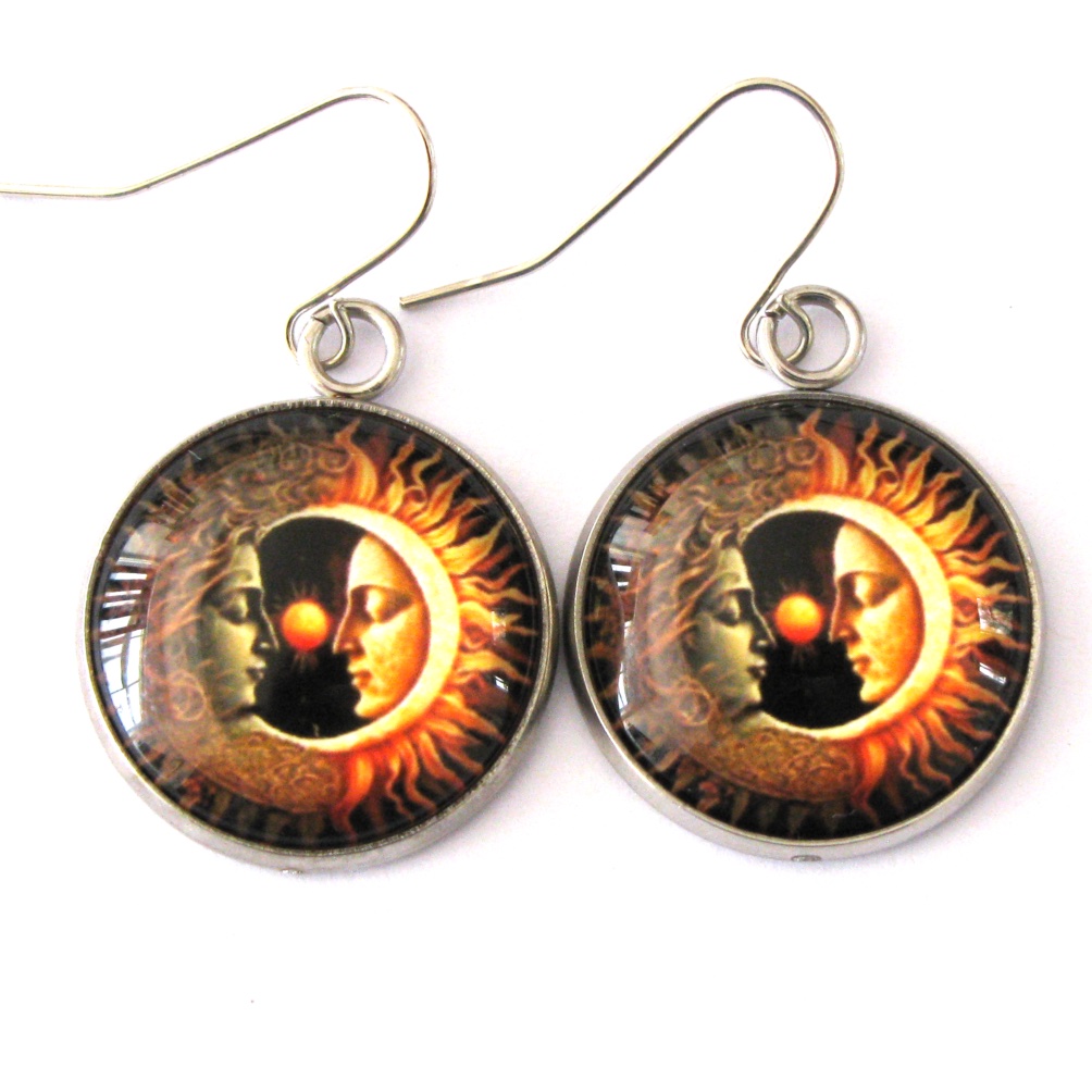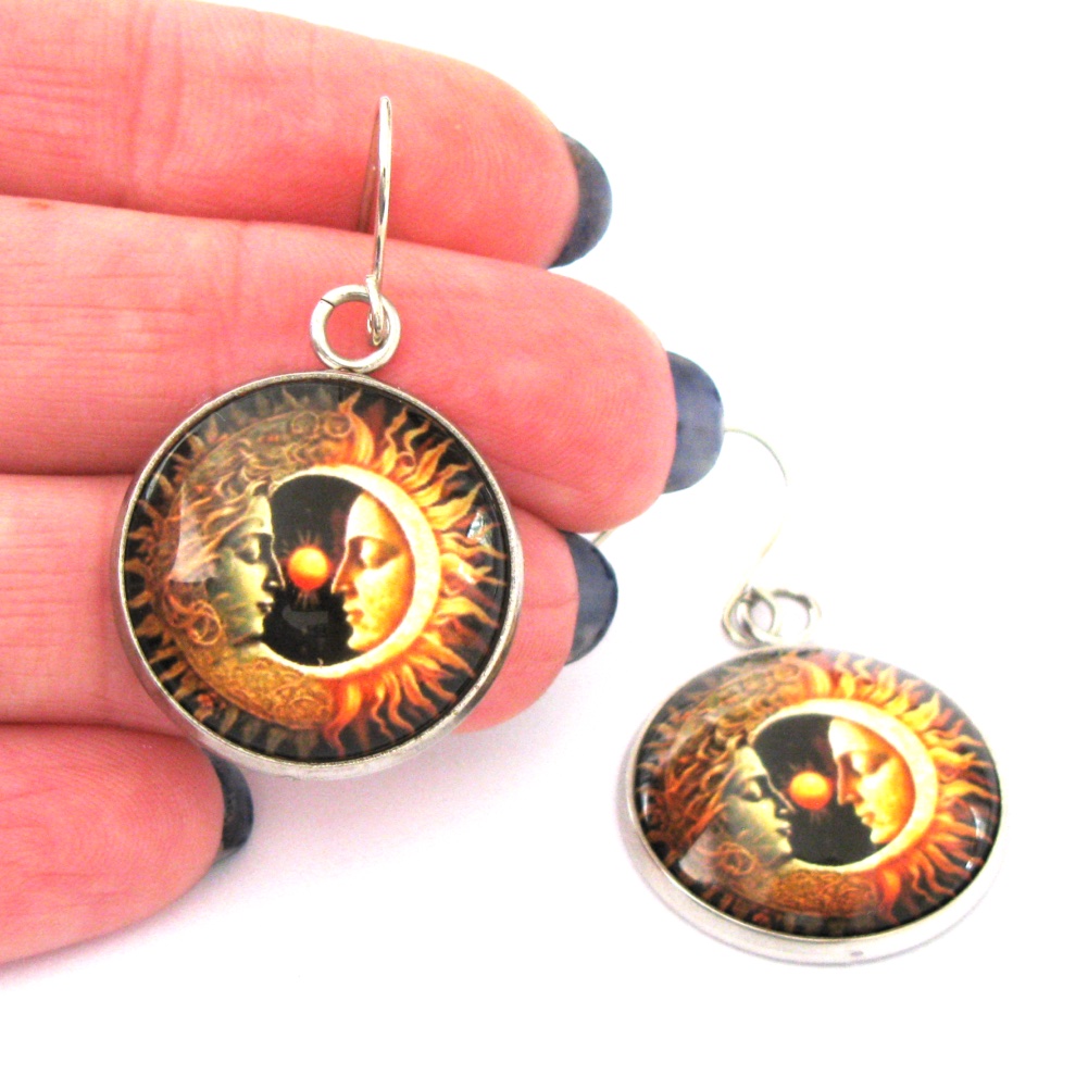 Sun and Moon cabochons set in silver bezels and dangling off of platinum Shepherd’s hook ear wires.