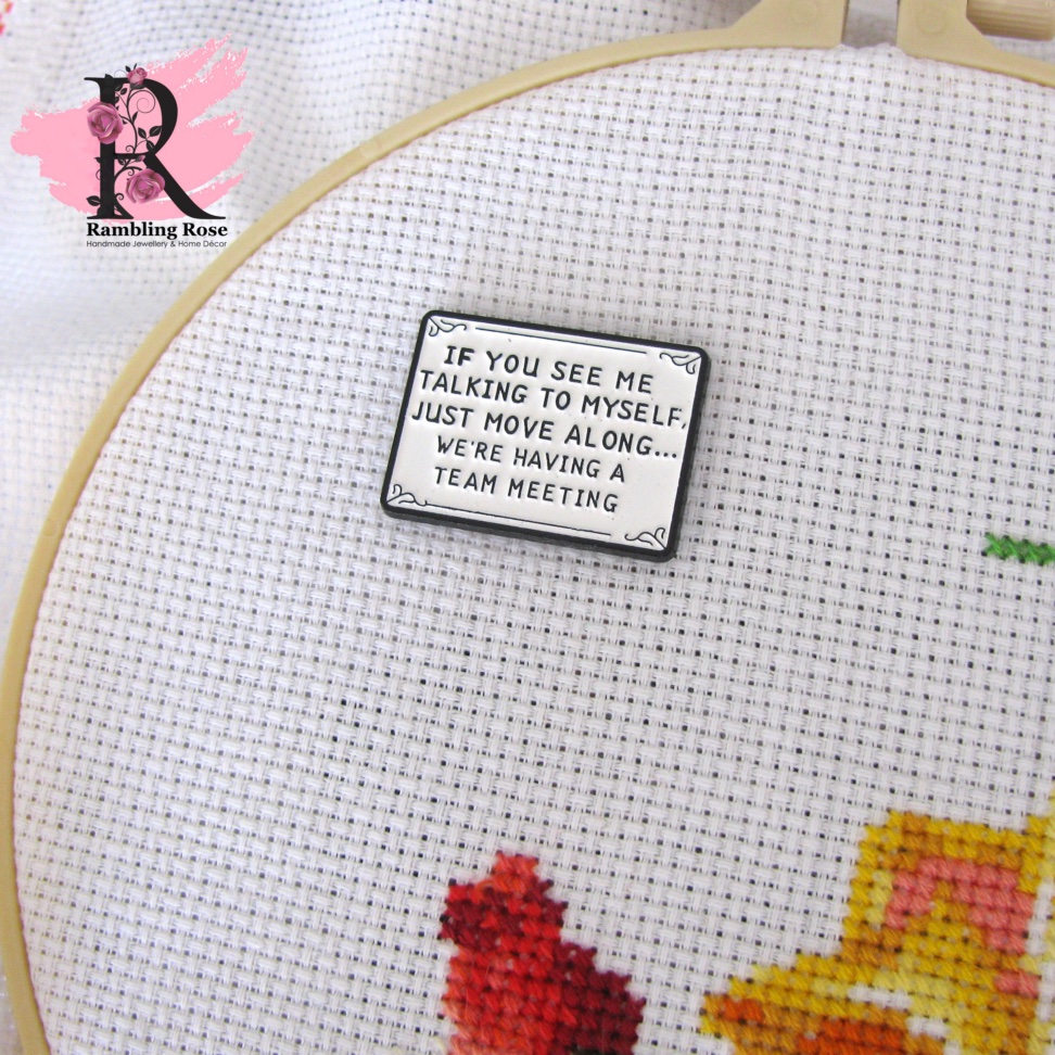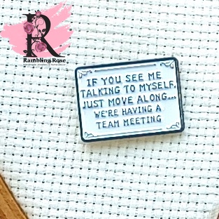 “If you see me talking to myself, just move along … We’re having a team meeting.”Β Enamel magnetic needle minder to keep your needle safe while you’re changing floss colours or storing your item between stitching sessions.