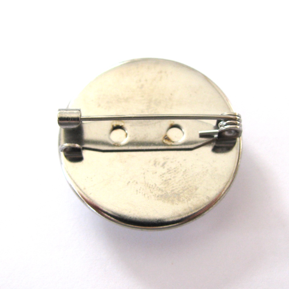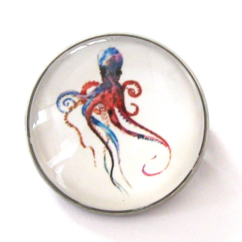 Watercolour octopus design under an acrylic cabochon, set in a stainless steel round bezel with a brooch pin back.