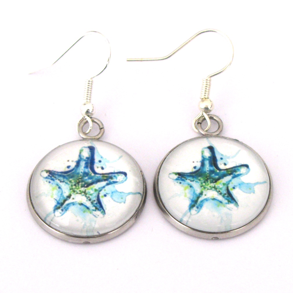 Serene blue and green Starfish are set in silver bezels and dangle off of silver French hooks.