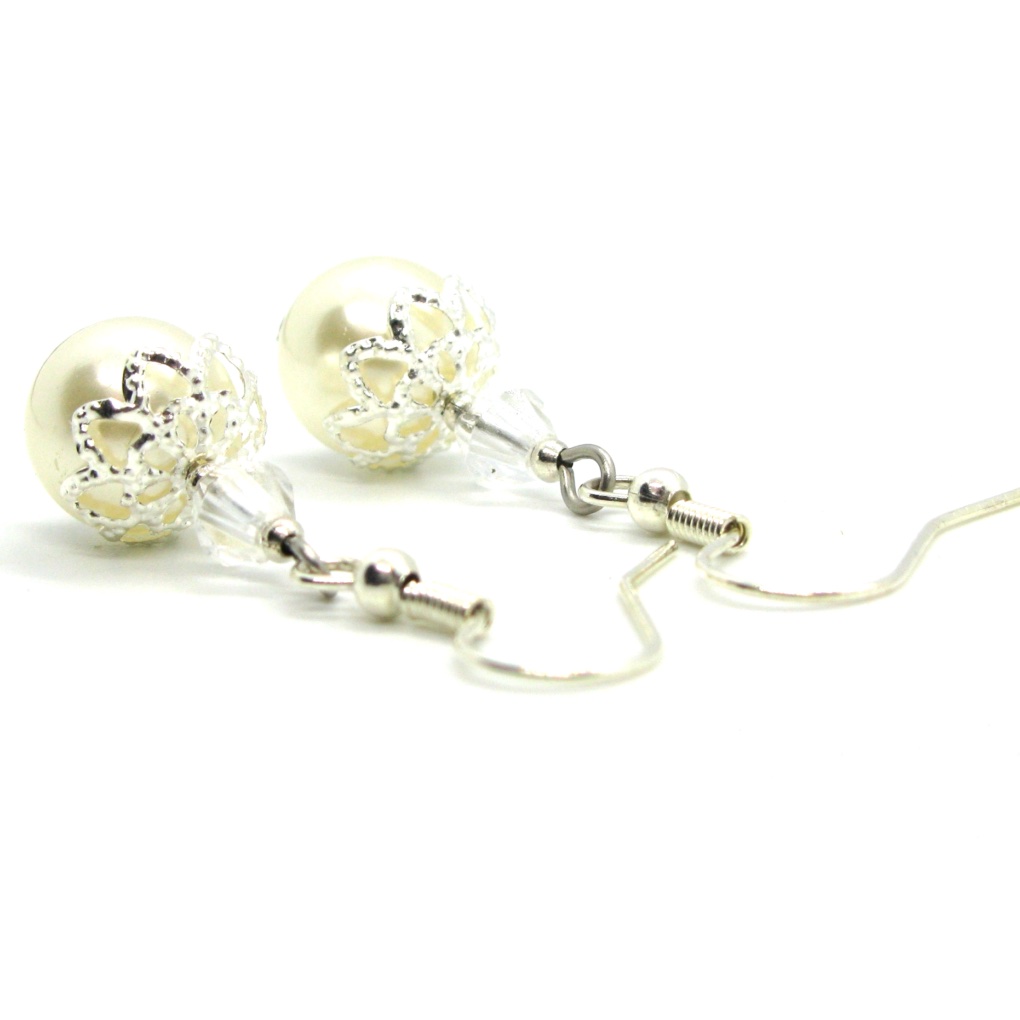 10mm white pearls with silver accents and clear crystals on silver French hooks.