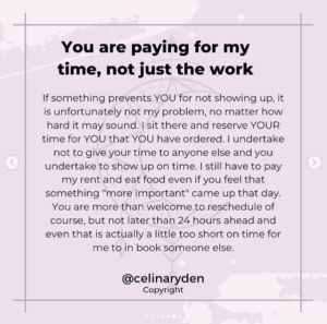 PS: If you don't show up for an appointment and don't cancel in advance, you will be charged accordingly per the T&Cs on the online booking system.